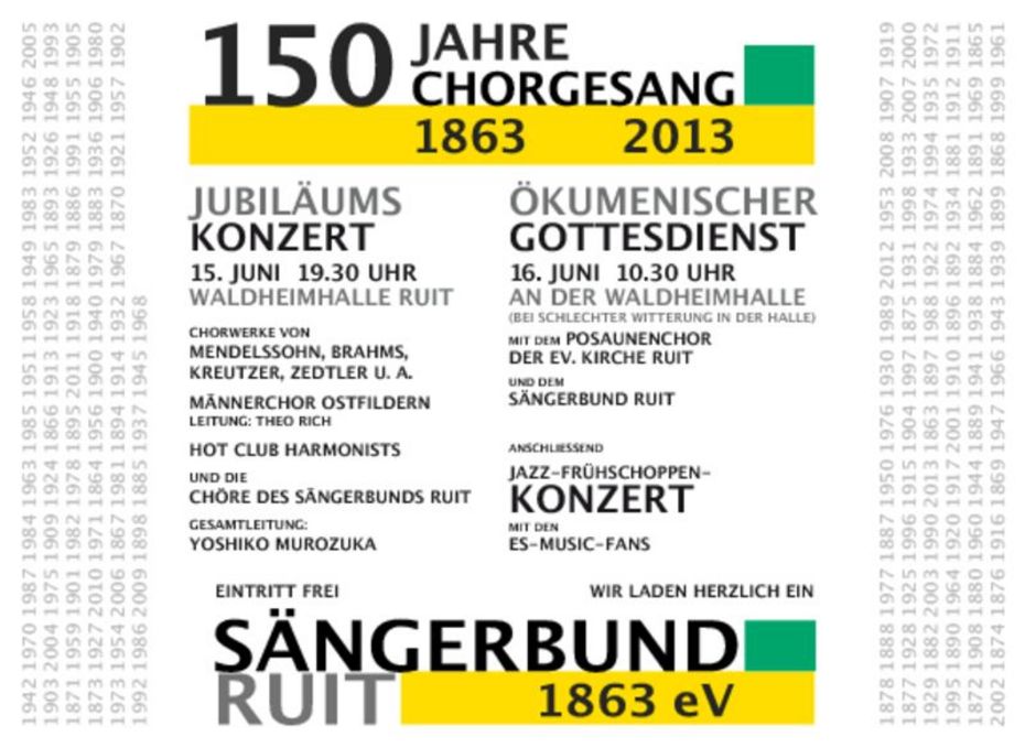 Der Sängerbund Ruit feiert in diesem Jahr 150 Jahre Chorgesang in Ruit. Wir laden herzlich ein zu unseren Festveranstaltungen: am Samstag, 15. Juni um 19.30 Uhr zum Jubiläumskonzert in der Waldheimhalle in Ruit. Es wird gestaltet vom gemischten Chor des Sängerbundes Ruit, vom Männerchor Ostfildern und den Hot Club Harmonists. Die Gesamtleitung hat Yoshiko Murozuka. Der Eintritt ist frei. Die Sängerinnen und Sänger treffen sich zum Ansingen um 18 Uhr in der Waldheimhalle.